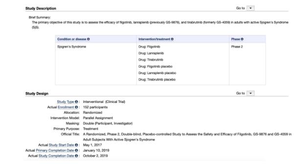 除了filgotinib,狼疮和干燥综合征的两项试验还涉及吉利德lanraplenib(又称GS-9876),这是一种Syk激酶抑制剂。而针对干燥综合征的试验NCT03100942,还测试了tirabrutinib(又称GS-4059),这是吉利德与Ono Pharmaceutical合作开发的一种BTK抑制剂。