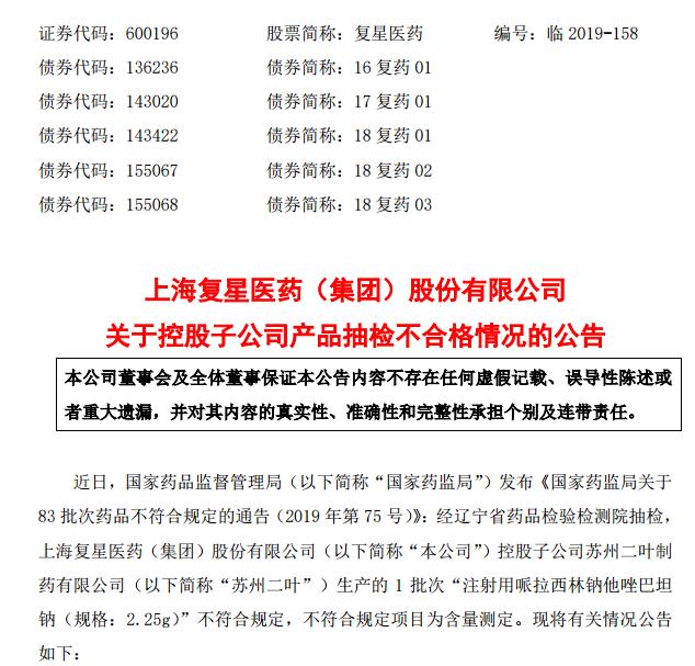 得注意的是,在复星医药发布公告之前,国家药监局官网于10月25日发布通告称,有68家企业生产的83批次药品不符合规定,苏州二叶制药有限公司位列其中。