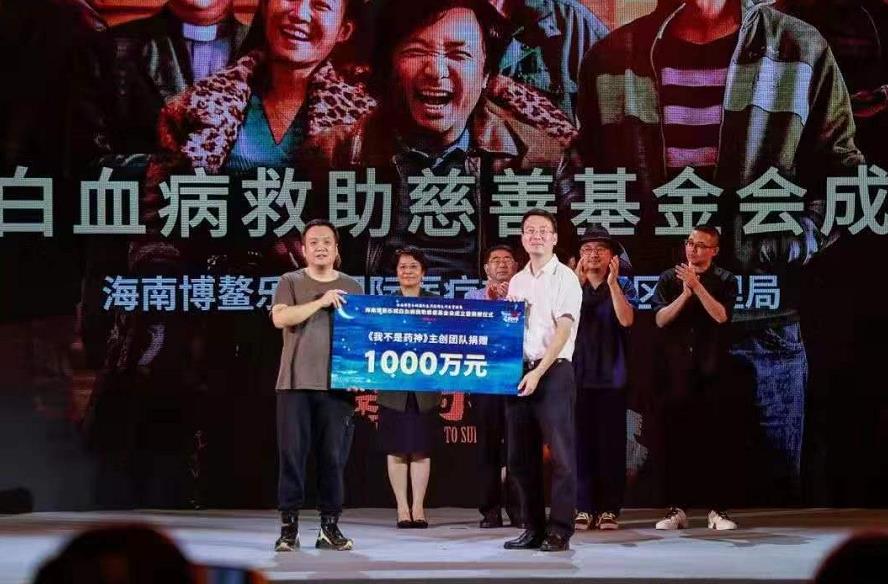 11月11日,在电影《我和我的祖国》为新中国成立70周年献礼之际,宁浩、徐峥、文牧野等三位著名导演代表《我不是药神》主创团队现身海口,向海南博鳌乐城白血病救助慈善基金会捐赠1000万元,为白血病等贫困重症血液病患者就医、诊疗和康复提供资助,践行电影服务大众、电影服务社会的使命。海南省委常委、宣传部长肖莺子,副省长王路出席仪式并为基金会揭牌。