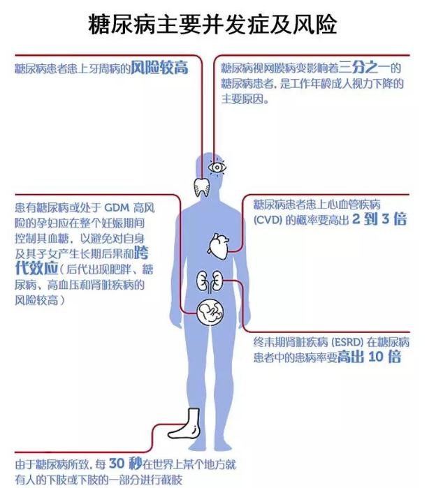 长期高血糖水平会导致广泛的血管损伤,其并发症主要包括糖尿病性神经病变、糖尿病性心脑血管病、眼病、肾病以及糖尿病足等。