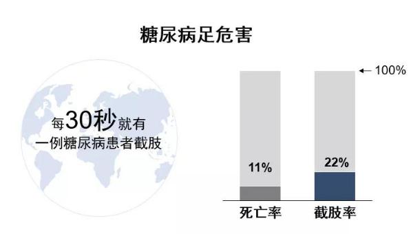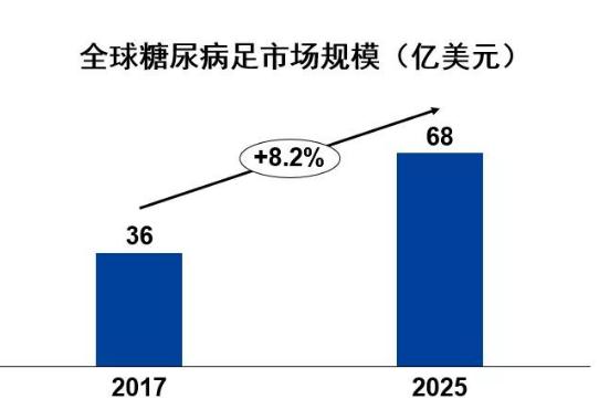 依据Grand View Research的市场调查报告,糖尿病足溃疡的全球市场规模在2017年为36亿美元,且于2019年至2025年间将以每年8.2%的速度增长。