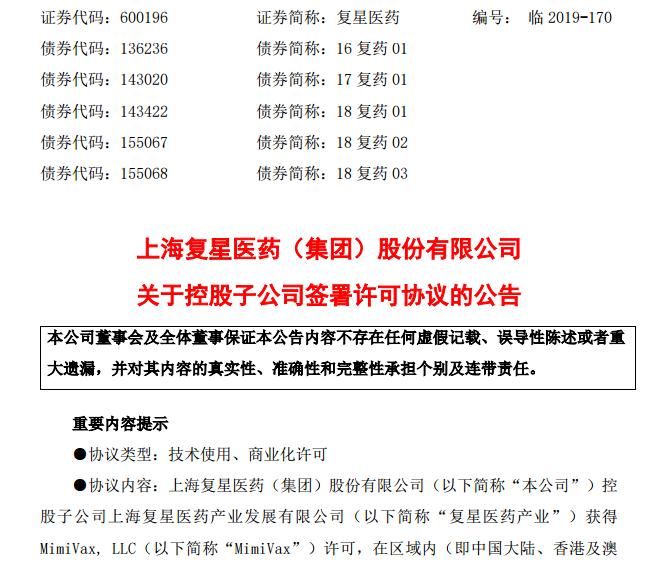 根据协议,复星医药产业将根据约定向MimiVax支付至多3800万美元的许可费用以及支付相应的销售里程碑等款项,自产品于区域内启动商业化销售后,复星医药产业将根据产品年度净销售额达成情况,向MimiVax支付至多1.1亿美元的销售里程碑款项。此外,复星医药产业应于《许可协议》约定的销售提成期间内,根据产品年度净销售额达成情况、按年度毛利与年度净销售额的比率的12%至18%的比例区间支付销售提成。