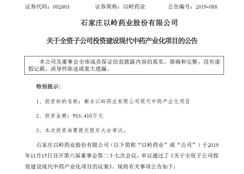 对于此次以岭药业在中药领域的巨资投入,有分析人士表示,其是看中了中药产业未来发展的巨大市场潜力。