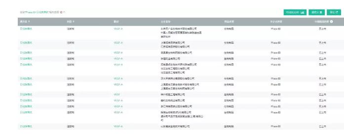 截至目前,FDA共批准两款贝伐珠单抗生物类似物,分别为Mvasi(安进/艾尔建,2017/9/14)和Zirabev(辉瑞,2019/6/18)。国内市场上布局贝伐珠单抗生物类似物的厂家超过20家。除了齐鲁和信达两家申报上市外,恒瑞、百奥泰、正大天晴、东曜药业、绿叶制药等12家企业处于III期临床阶段。