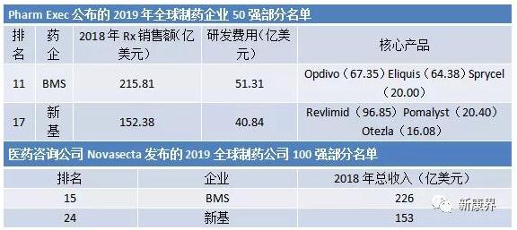 据美国《制药经理人》(Pharm Exec)杂志公布的2019年度基于处方药销售的《全球制药企业50强》排行榜(Pharm Exec's Top 50 Companies 2019)显示,BMS和新基分别位于榜单第11位及17位;而据另一份来自医药咨询公司 Novasecta 的全球制药公司100强榜单显示,BMS和新基分别位于榜单第15位和24位。可见,两家企业的整体实力都很强,且排名相差不多。照此估计,合并之后的新公司年收入可达到370亿美元左右,有望挤进这类榜单的前十。也就是说,全球制药竞争格局将会发生显着变化。
