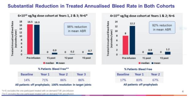 在国际血栓和止血学会2019年会(ISTH2019)上公布的最新数据显示,在1/2期临床试验中接受一次剂量为6e13 vg/kg的基因疗法治疗的患者,在接受治疗后第三年,年出血率(ABR)和使用因子VIII的需求继续得到控制。在接受治疗的3年过程中,ABR和因子VIII使用率都平均下降96%。患者不再需要预防性因子VIII注射。