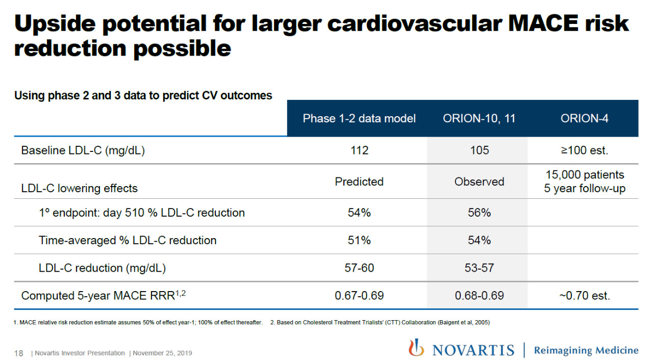 目前,诺华和The Medicines Company正在进行名为ORION-4的3期临床试验,旨在验证inclisiran在降低MACE风险和心血管死亡方面的效果。这一临床试验预计将在2024年获得结果。根据LDL-C水平和MACE风险之间的相关模型以及已有的2期和3期临床数据,诺华预计,在ORION-4临床试验中,inclisiran可能将患者的MACE风险降低30%左右。