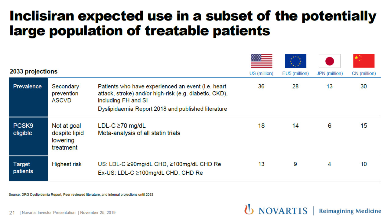 在电话会议上,诺华展示了可能从inclisiran疗法获益的潜在患者数目。在美国、欧盟和中国,到2033年,需要接受二级预防(secondary prevention)的患者数目总计将达到9400万人。