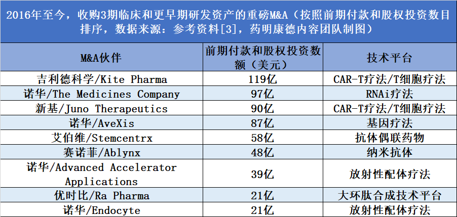 自2014年以来,诺华达成40项获取在研疗法独家研发权益,以及共同开发在研疗法的合作。这些数据表明,通过合作和收购获取外部研发创新正在成为诺华提高研发管线中创新产品的重要手段。这一策略也在其它大型药企的M&A交易中得到体现。2016年以来,包括吉利德科学(Gilead Sciences)在内的多家大型药企也通过这种方法获得多种创新技术平台(见下表)。