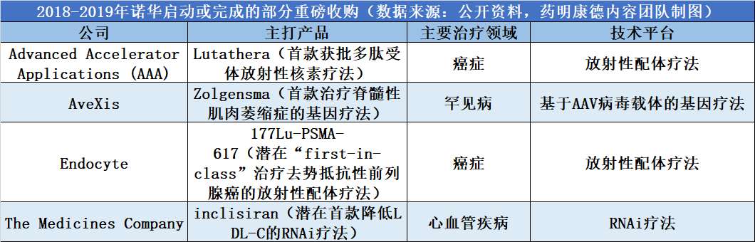 仅在过去两年,诺华已经完成或启动4项重磅收购,其中包括开发放射性药物的Advanced Accelerator Applications(AAA)和Endocyte,致力于开发基因疗法的AveXis,以及开发RNAi疗法的The Medicines Company。这些收购不但获得了潜在重磅疗法,也为诺华提供了开发创新治疗模式的技术平台。
