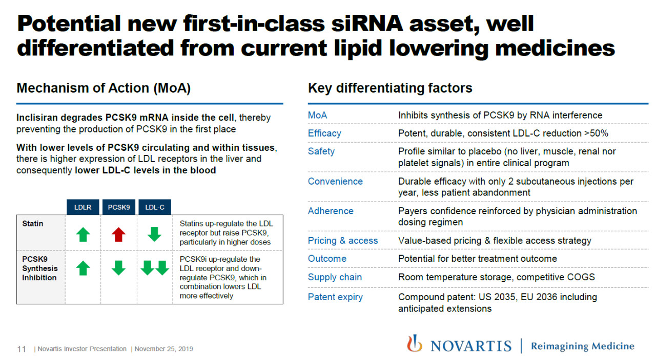 [1] Novartis to acquire The Medicines Company for USD 9.7 bn, adding inclisiran, a potentially transformational investigational cholesterol-lowering therapy to address leading global cause of death. Retrieved November 25, 2019, from https://www.novartis.com/news/media-releases/novartis-acquire-medicines-company-usd-97-bn-adding-inclisiran-potentially-transformational-investigational-cholesterol-lowering-therapy-address-leading-global