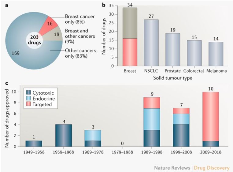 乳腺癌是全球女性中常见的恶性肿瘤,该领域的新药开发也因此一直备受关注。全球每年新增乳腺癌病例多达170万,且每年约有24.12%以上的乳腺癌患者死亡。从1949年FDA首次批准抗肿瘤药物至今已经经历70余年,为此,新一期的《nature review》对1949年-2018年70年来FDA批准的肿瘤药物进行了总体分析,并重点分析了乳腺癌肿瘤药物。