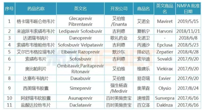 图表:中国批准上市的抗丙肝口服抗病毒药物。来源:米内网