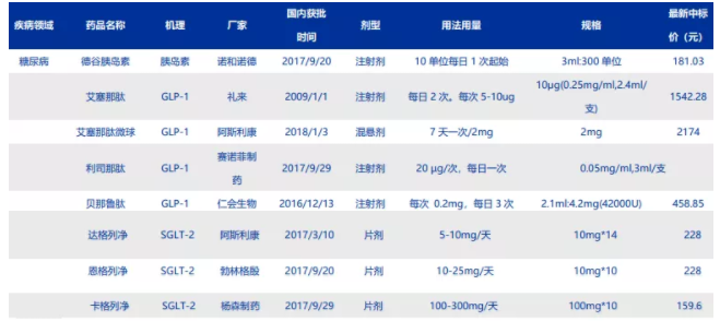 2017年在中国获批的SGLT-2抑制剂有阿斯利康的达格列净、勃林格殷格翰的恩格列净、杨森制药的卡格列净,此次三款糖尿病药全部进入医保。此外还有GLP-1受体抑制剂利司那肽(赛诺菲)、艾塞那肽注射液(礼来)进入医保。