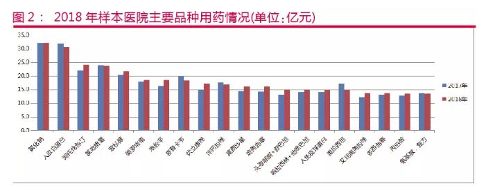 从样本医院通用名品种来看,2018年前10位品种购入金额占总金额的9.7%;前20位品种占16.1%;前30位品种占21.6%;前50位品种占30.4%;前100位品种占45.7%;前200位品种占64.3%。
