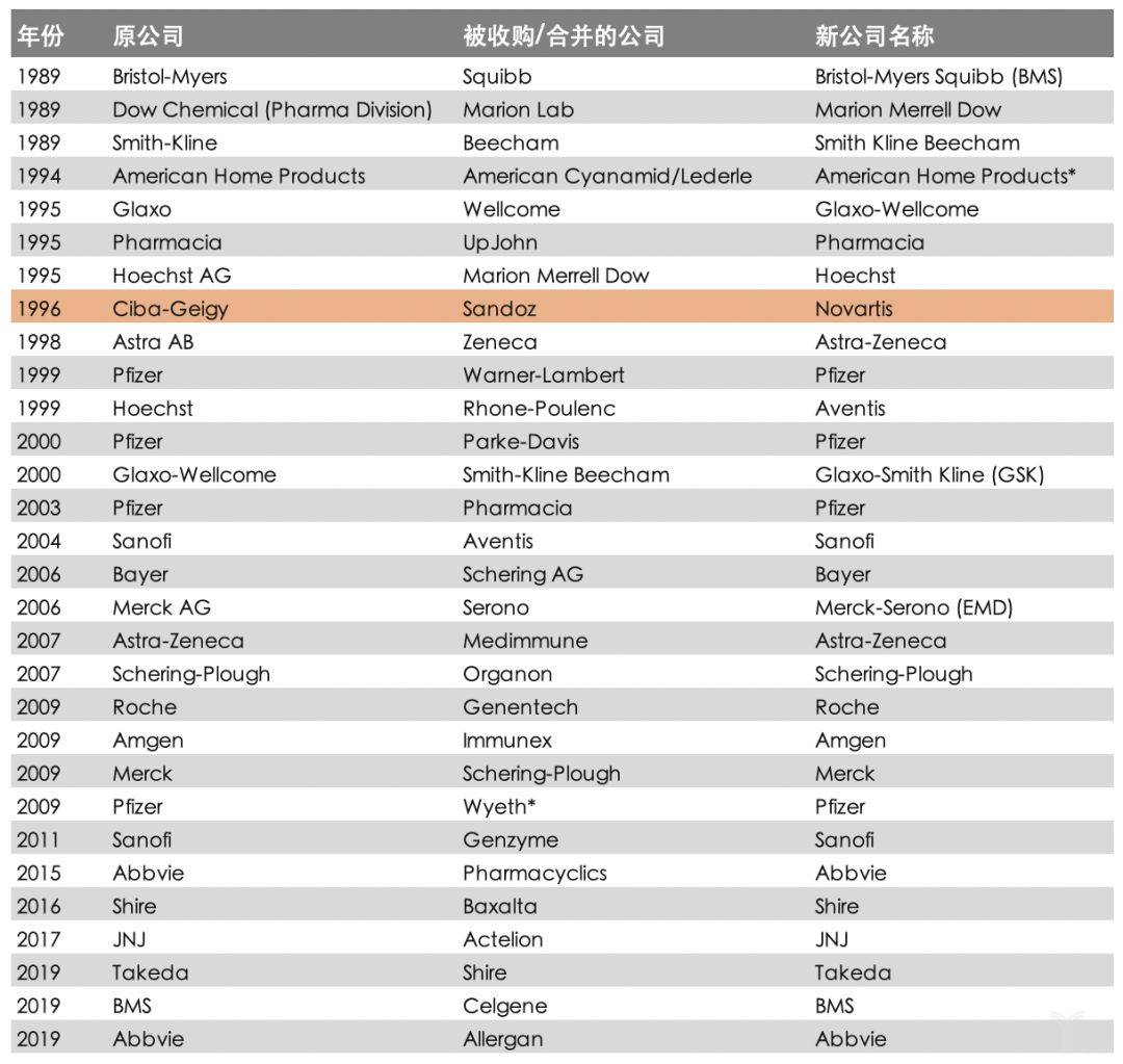 下表总结了部分发生在1989至2019年间,各大药企间的一些主要并购案(规模在200亿美元以上)。这种强强联手,已成为药企江湖里纵横椑阖的必杀技之一。
