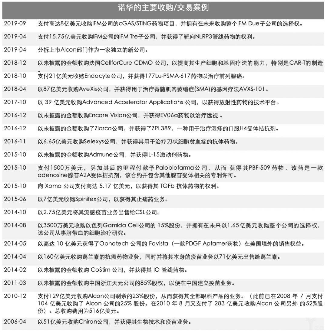以下是诺华近年来的主要收购/交易案例(因篇幅所限,主要集中于制药和疫苗药品方面,仿制药、消费者药品、农业/化学制品等收购并未列入):