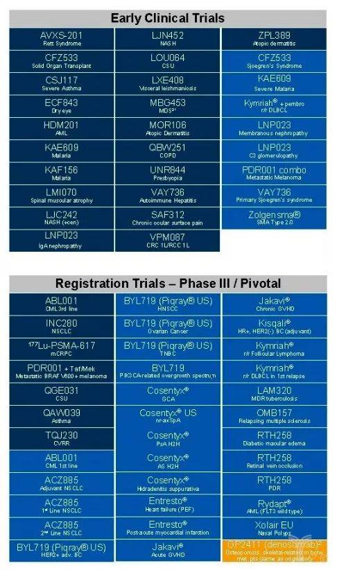 下面是诺华的主要管线药物的列表(深蓝色表示NME新药,浅蓝色表示已上市药物的新适应症,橙色则是生物仿制药):