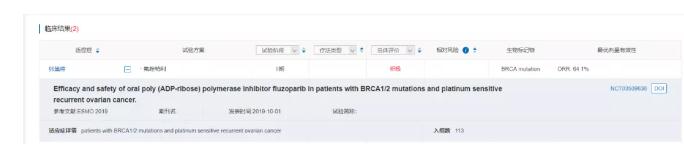 在既往经过二线及以上化疗的伴有BRCA1/2致病性或疑似致病性突变的复发性卵巢癌患者中开展的II期临床研究(NCT03509636)结果显示,受试者的ORR和DCR分别为64.1% 和95.1%,超过预设,毒性可耐受。