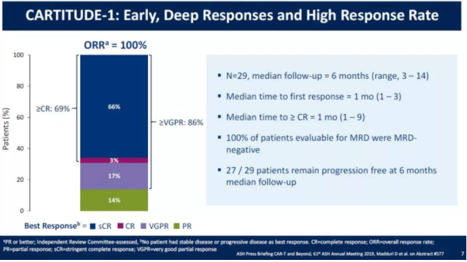 ASH开幕首日,杨森(Janssen)公司和南京传奇公司合作开发的JNJ-4528(又名LCAR-B38M)闪亮登场。这款携带两个靶向BCMA的抗体蛋白域的CAR-T疗法,在治疗R/R MM患者的CARTITUDE-1临床试验中,达到100%的ORR和69%的CR。这款CAR-T疗法有望在明年晚些时候递交BLA。