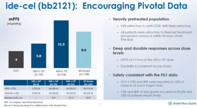 而BMS公司与bluebird bio公司合作开发,靶向B细胞成熟抗原(BCMA)的CAR-T疗法idecabtagene vicleucel(ide-cel,又名bb2121),在治疗复发难治性多发性骨髓瘤(R/R MM)患者的关键性2期临床试验中,也达到73.4%的ORR,CR达到31.3%。这款CAR-T疗法有望在明年初递交BLA。