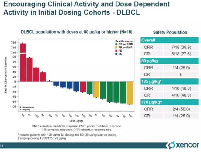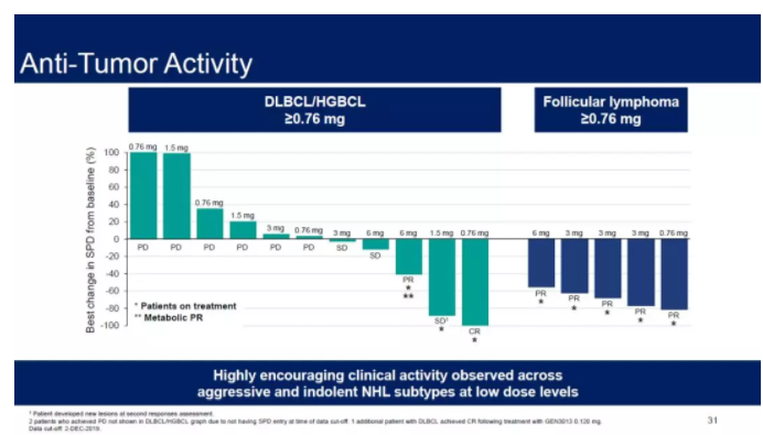 此外,Xencor公司的CD20-CD3双特异性抗体 XmAb13676在治疗R/R DLBCL患者时,以及Genmab公司的CD20-CD3双特异性抗体GEN3013在治疗R/R B细胞NHL患者时,都表现出可喜的抗癌活性。