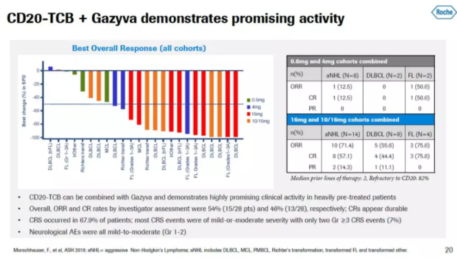 而CD20-TCB与抗CD20抗体Gazyva(obinutuzumab)联用,治疗R/R B细胞NHL患者的临床试验中,达到54%的ORR和46%的CR。