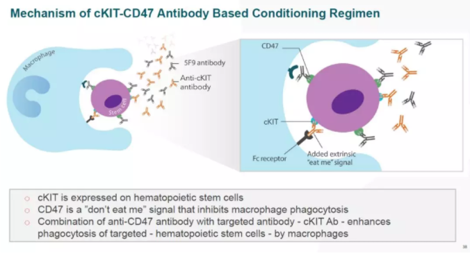 Forty Seven公司解决这一难题的策略是不用化疗或者放疗,而是使用抗体特异性消除体内的造血干细胞。该公司开发出一种靶向cKIT的人源化单克隆抗体。它与造血干细胞表面表达的从cKIT抗原相结合能够诱导巨噬细胞吞吃造血干细胞。CD47是细胞表面表达的“别吃我”信号,它可以抑制巨噬细胞的吞噬功能。将抗CD47抗体与抗从cKIT抗体联用,可以增强巨噬细胞吞噬造血干细胞的能力,从而达到清除体内造血干细胞的效果。