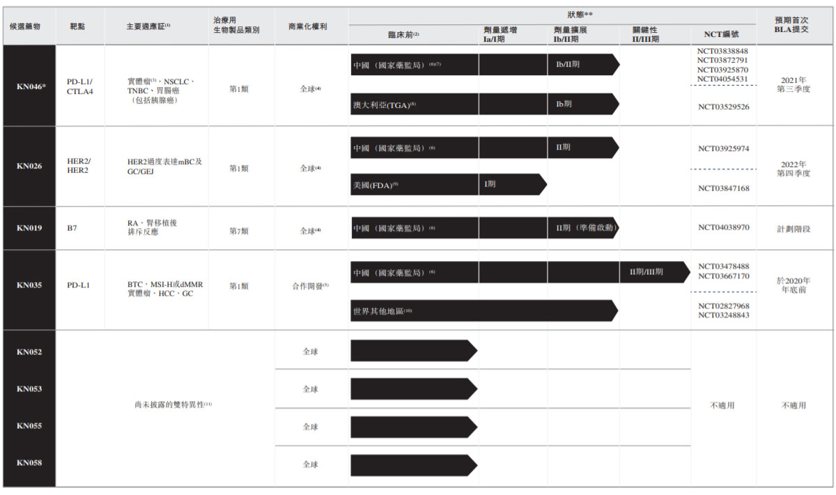 其中,双特异性抗体KN046是PD-L1/CTLA-4是针对目前仅有的两个经临床验证的肿瘤免疫靶点而设计的双特异性抗体,该产品可以同时阻断PD-L1和CTLA-4两种途径,在肿瘤免疫部分具有协同作用;HER2双特异性抗体KN026是该公司采用具有自主知识产权的Fc异二聚体平台技术(CRIB)开发的HER2双特异性抗体,识别HER2上的两个不同表位,公司计划于2020年上半年完成HER2高表达乳腺癌及胃癌/胃食管结合部癌的Ⅰb期试验;重组人CTLA-4抗体KN019是一款重组人CTLA-4变体Fc融合蛋白注射液,作用于CD80/CD86阻止T细胞的激活,用于预防接受肾移植的成年患者器官排异反应,其优越疗效已在临床试验的长期跟踪研究中得到充分证实;KN035则是目前全球首个进入临床开发的PD-L1单域抗体,具有可皮下注射,常温下稳定等优点,从而提高病人用药依从性,具有显著优势。