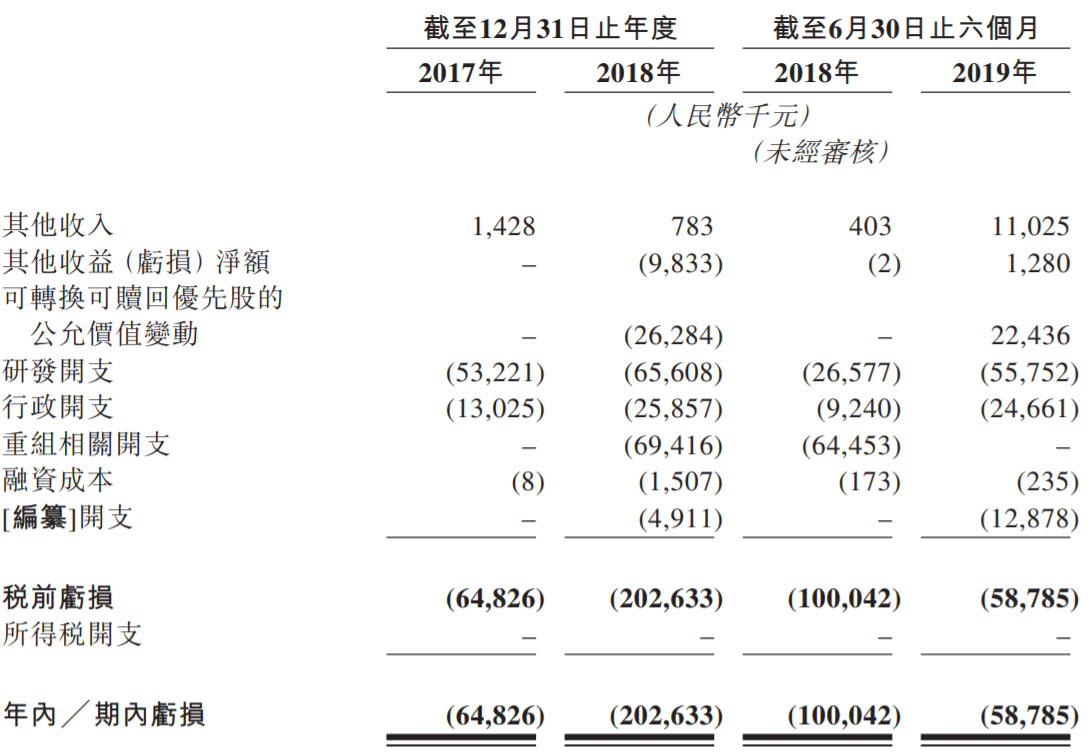 在财务营收方面,由于还未有产品上市,康宁杰瑞目前的营收较少。同时,由于费用前置,公司2017、2018年、2019年上半年期内亏损分别达到了6482.6万、2.03亿、5878.5万元,不过,2018年亏损大幅扩大的重要原因是受非经营性的可转换可赎回优先股的公允价值变动以及重组相关开支的影响。