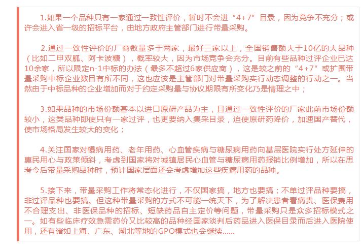 1.如果一个品种只有一家通过一致性评价,暂时不会进“4+7”目录,因为竞争不充分;或许会进入省一级的招标平台,由地方政府主管部门进行带量采购。