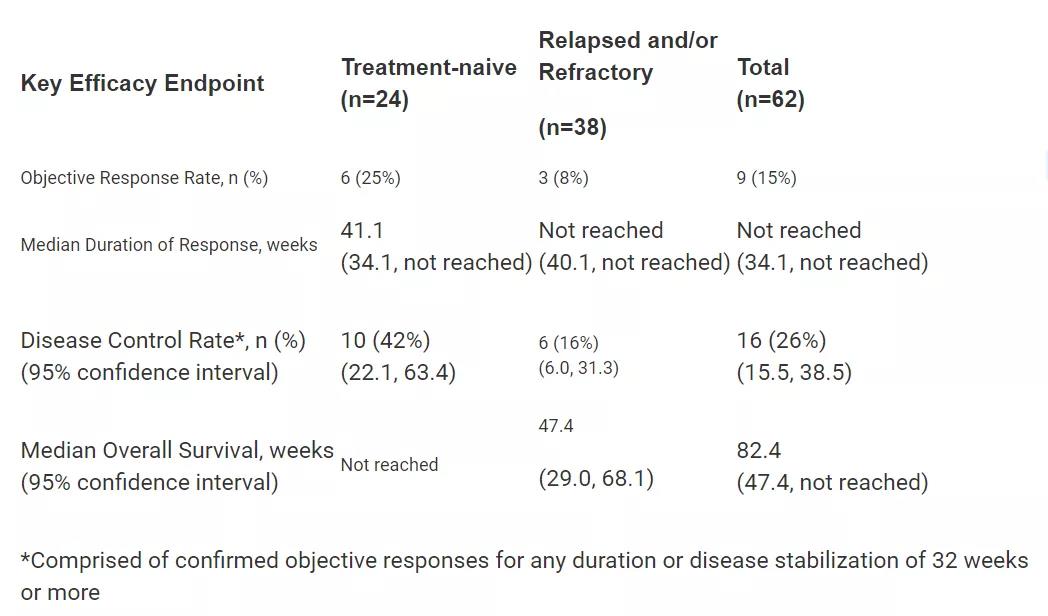 Tazemetostat的新药申请是基于它在一项2期临床试验中的表现。在这项试验中,24名初治和38名复发/难治性上皮样肉瘤患者接受了tazemetostat的治疗。试验结果表明,截至2018年9月,tazemetosta的客观缓解率为15%,疾病控制率达到26%,中位总生存期尚未达到。