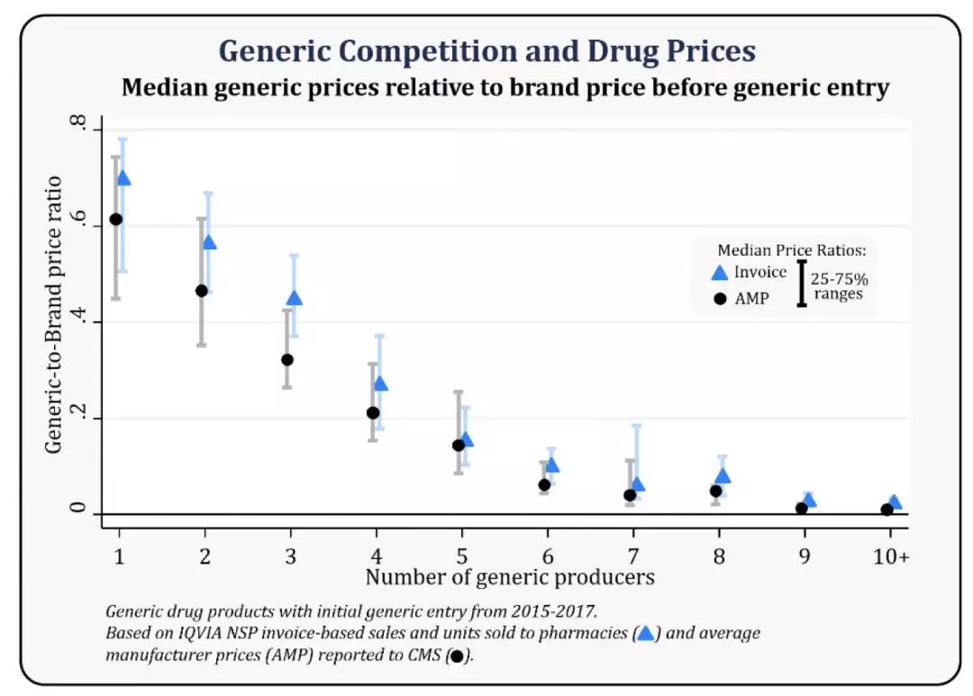 纵坐标是仿制药与品牌药的价格中位数的比值,横坐标是仿制药生产商的数量。