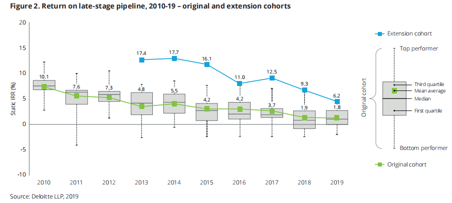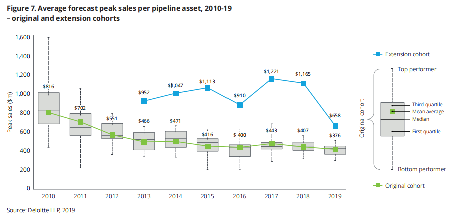 2019年,每项后期管线资产的平均预测峰值销售首次跌破4亿美元,从2018年的4.07亿美元下降至2019年的3.76亿美元,较2010年降幅超过50%。