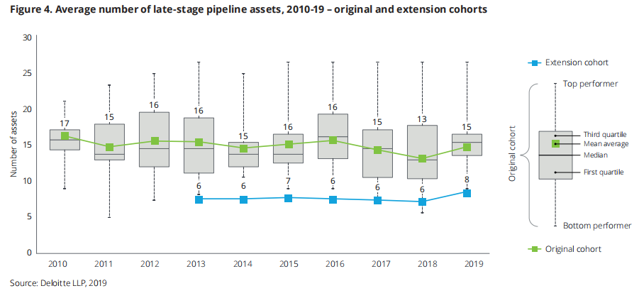 报告还指出,回报降低是内部和外部生产力挑战的共同结果。近年来,TOP12公司后期管线资产的数量逐渐减少,在2018年达到最低点159个,平均每家13.25个。不过,在2019年,这些公司已补充了后期管线,资产数量已增加至183个,创三年来的新高,并且非常接近于10年平均值186.5个。