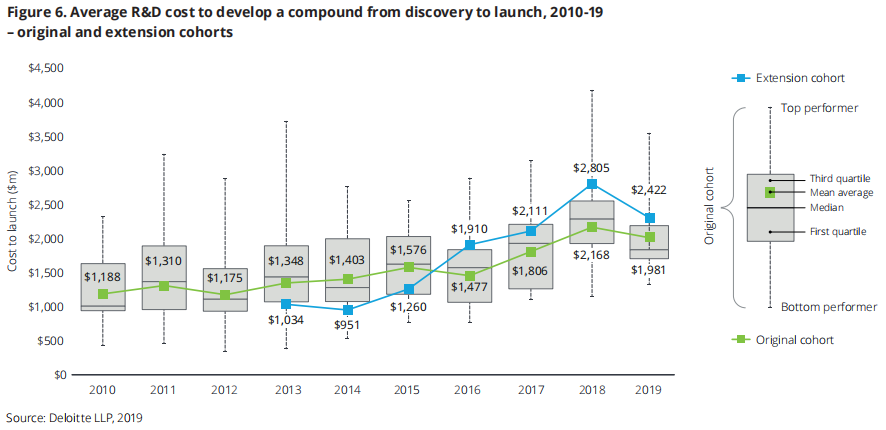 此外,成功上市一个新药的成本从2018年的21.68亿美元下降至2019年的19.81亿美元,但较2010年的11.88亿美元相比增幅高达67%。