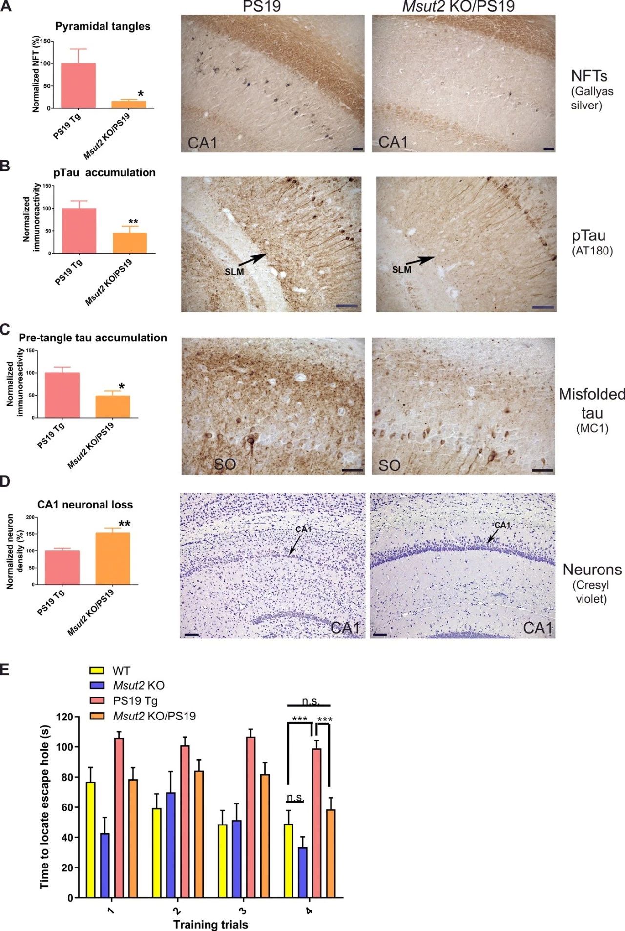 通过在小鼠中敲除MSUT2基因,他们成功阻止了可杀死脑细胞的Tau蛋白缠结的形成,并减轻了学习和记忆问题。