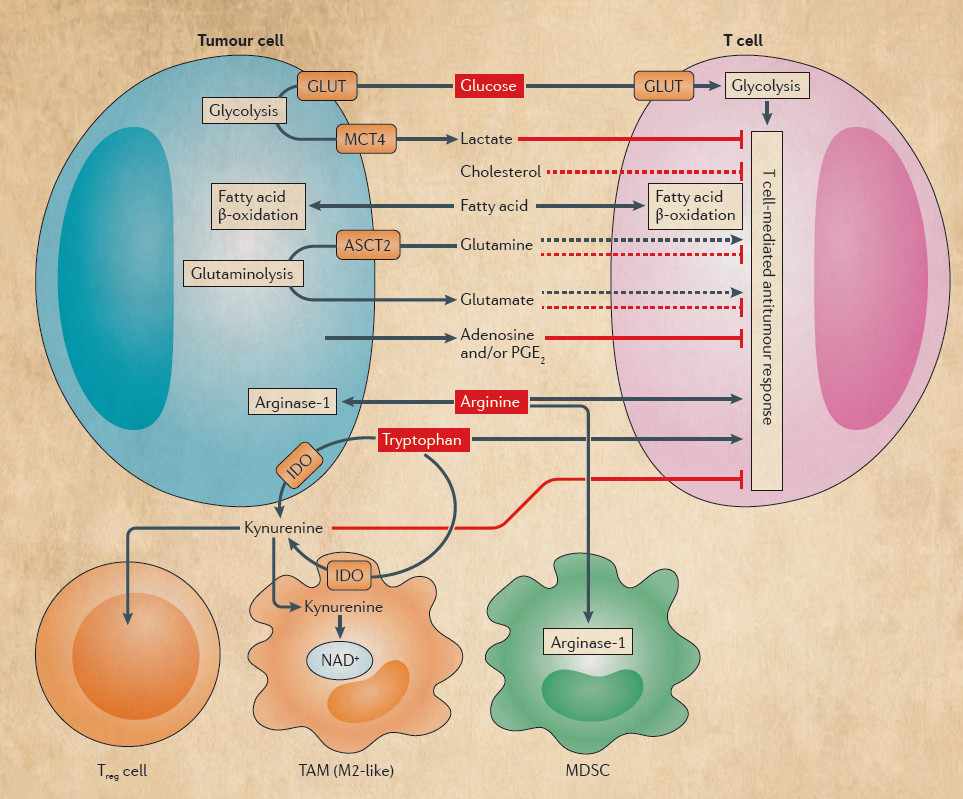 图3显示了肿瘤微环境中活跃的代谢通路以及这些通路对抗肿瘤免疫力的影响。肿瘤细胞会形成缺乏葡萄糖但乳酸富集的肿瘤微环境,这种微环境会损伤T细胞功能以及抗肿瘤免疫反应。T细胞和肿瘤细胞之间对氨基酸的竞争也会抑制抗肿瘤免疫力。在肿瘤微环境中,肿瘤细胞的竞争也会影响T细胞的脂肪酸可用性。肿瘤细胞和其它免疫调节细胞产生的其它代谢物(如腺苷、前列腺素E2)也参与了对T细胞介导的抗肿瘤反应的抑制。