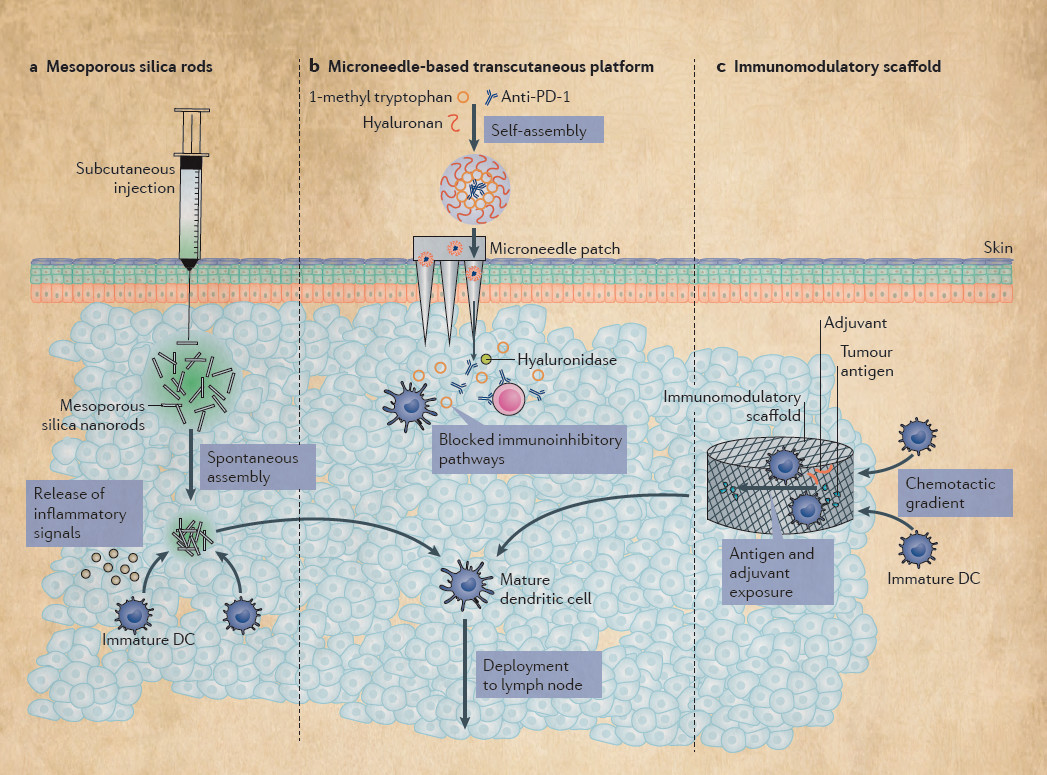 一些生物材料和方法正在被探索,以实现癌症免疫疗法的局部递送。在图9左侧,介孔二氧化硅棒在体内自发地组装并招募宿主细胞;在图9中间,基于微针的经皮给药技术平台负载了自我组装的免疫疗法纳米载体;图9右侧显示了皮下递送多孔生物材料支架,该支架可释放一种化学引诱物,将naive树突状细胞(DCs)招募到其空隙中,从而导致主要组织相容性复合体(MHC) -肽复合物上肽的呈递增加。