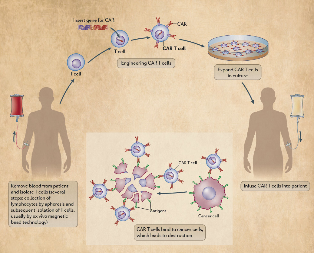 图12提供了CAR-T细胞疗法的概况。CAR-T细胞治疗是指从患者外周血中分离出T细胞,然后利用病毒或非病毒载体将编码嵌合抗原受体(CAR)的基因插入到T细胞的基因组中。之后,CAR-T细胞在体外扩增,然后再回输到患者体内。在CAR-T细胞表面表达的CAR会识别表达在肿瘤细胞表面的一个抗原,然后激活CAR-T细胞发挥杀伤肿瘤细胞的作用。