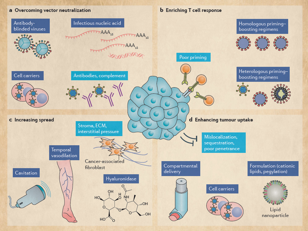 图10描述了限制溶瘤病毒临床益处的障碍(淡蓝色)。为优化治疗反应,应采取生物工程、分子和免疫学方法(深蓝色),以实现以下目标:1)避免病毒载体被抗体中和;2)通过避免肿瘤细胞以外的细胞类型对溶瘤病毒进行“扣押”,提高肿瘤对溶瘤病毒的吸收;3)通过调节细胞外基质(ECM)增加溶瘤病毒扩散;4)丰富T细胞对肿瘤抗原的反应。