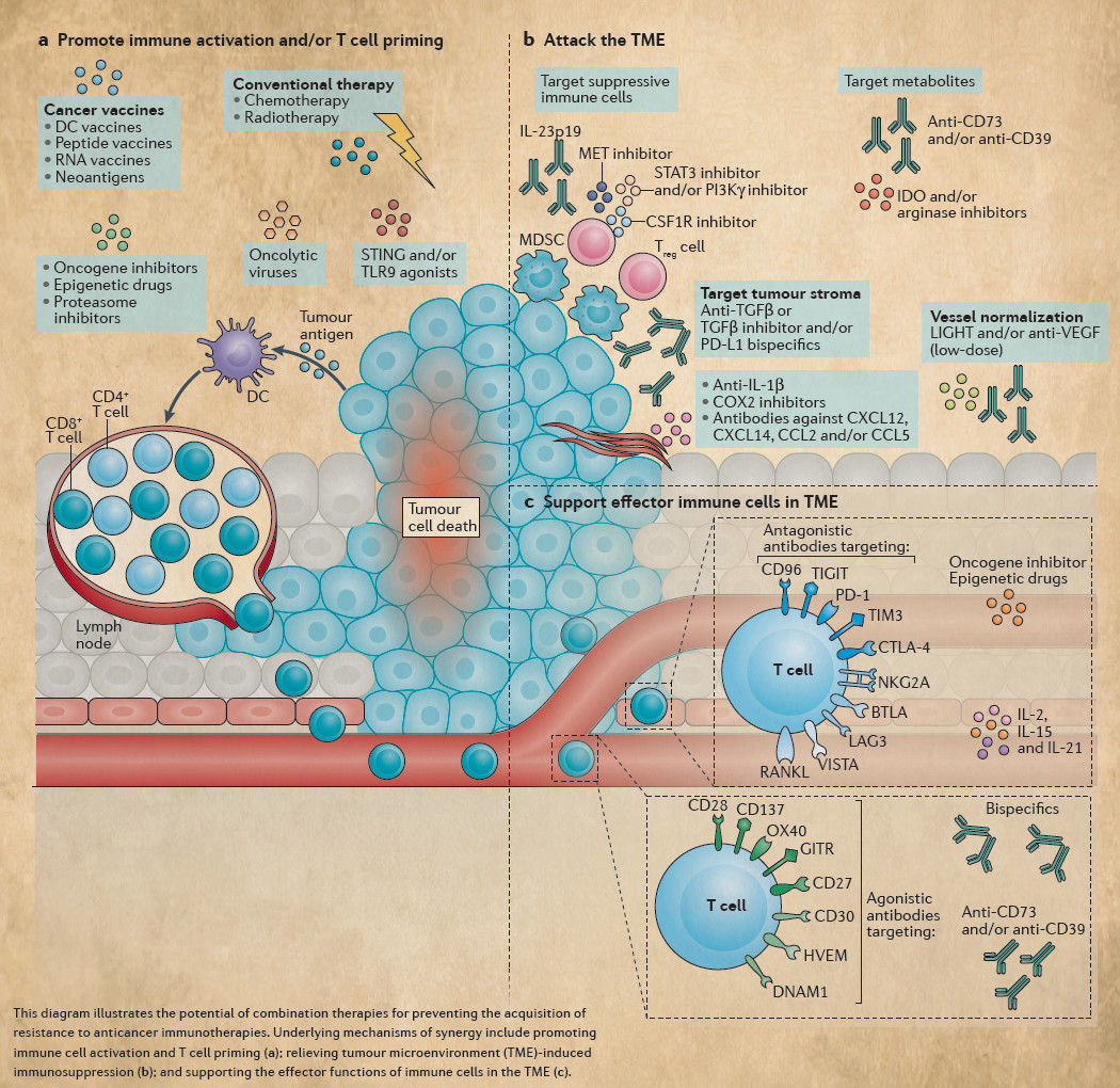 图7说明了联合治疗在预防获得抗癌免疫治疗耐药性方面的潜力。潜在的协同机制包括进免疫细胞激活和T细胞启动(a)、缓解肿瘤微环境诱导的免疫抑制(b)、支持肿瘤微环境中免疫细胞的效应功能(c)。