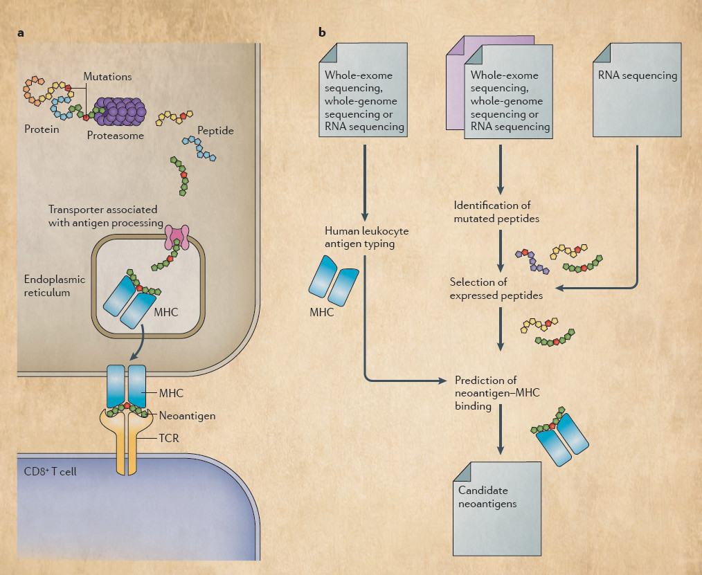 图11(a)描述了新抗原(neoantigen)起源于癌细胞表达的突变蛋白,并在抗原呈递细胞表面显示,以被CD8+ T细胞的T细胞受体(TCRs)识别的过程;图11(b)显示了基于下一代测序数据预测候选新抗原的计算路线。