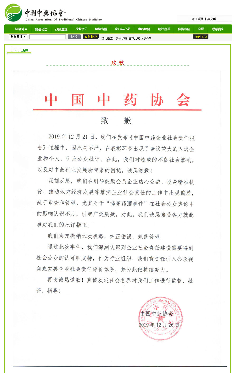 12月26日,中国中药协会官网发布致歉函,表示由于把关不严,在表彰环节出现了争议较大的入选企业和个人,引发公众批评,最终决定撤销表彰,纠正错误,规范管理。