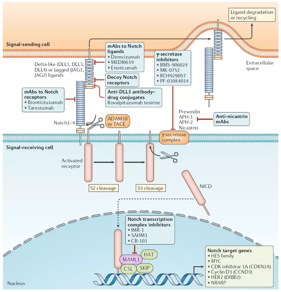 利用单克隆抗体靶向Notch配体是抑制异常Notch信号的另一种策略,如DLL抗体Demcizumab。此外,也有团队开发靶向Notch受体的抗体,如抗Notch1的单抗Brontictuzumab、同时靶向Notch2和Notch3的全人源IgG2抗体Tarextumab。