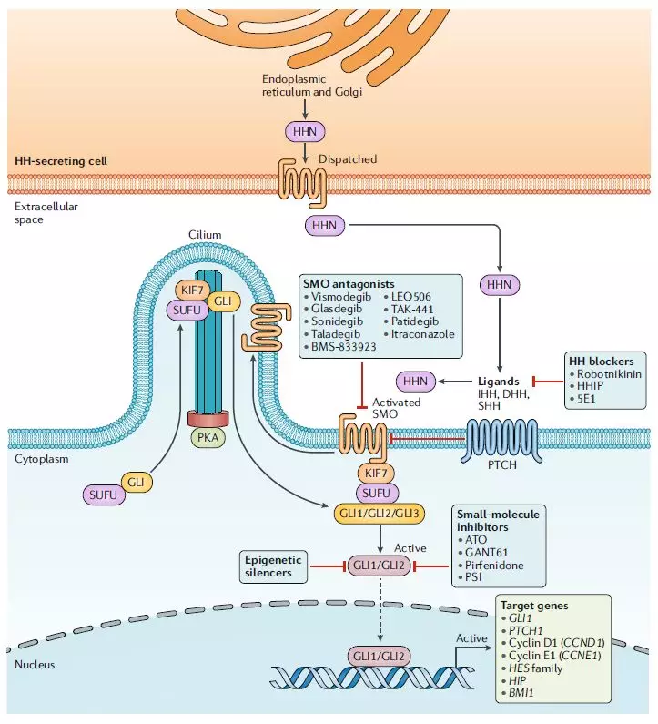 图3 经典Hedgehog信号通路以及作为抗癌疗法的相关在研抑制剂(图片来源:Nature Reviews Clinical Oncology)