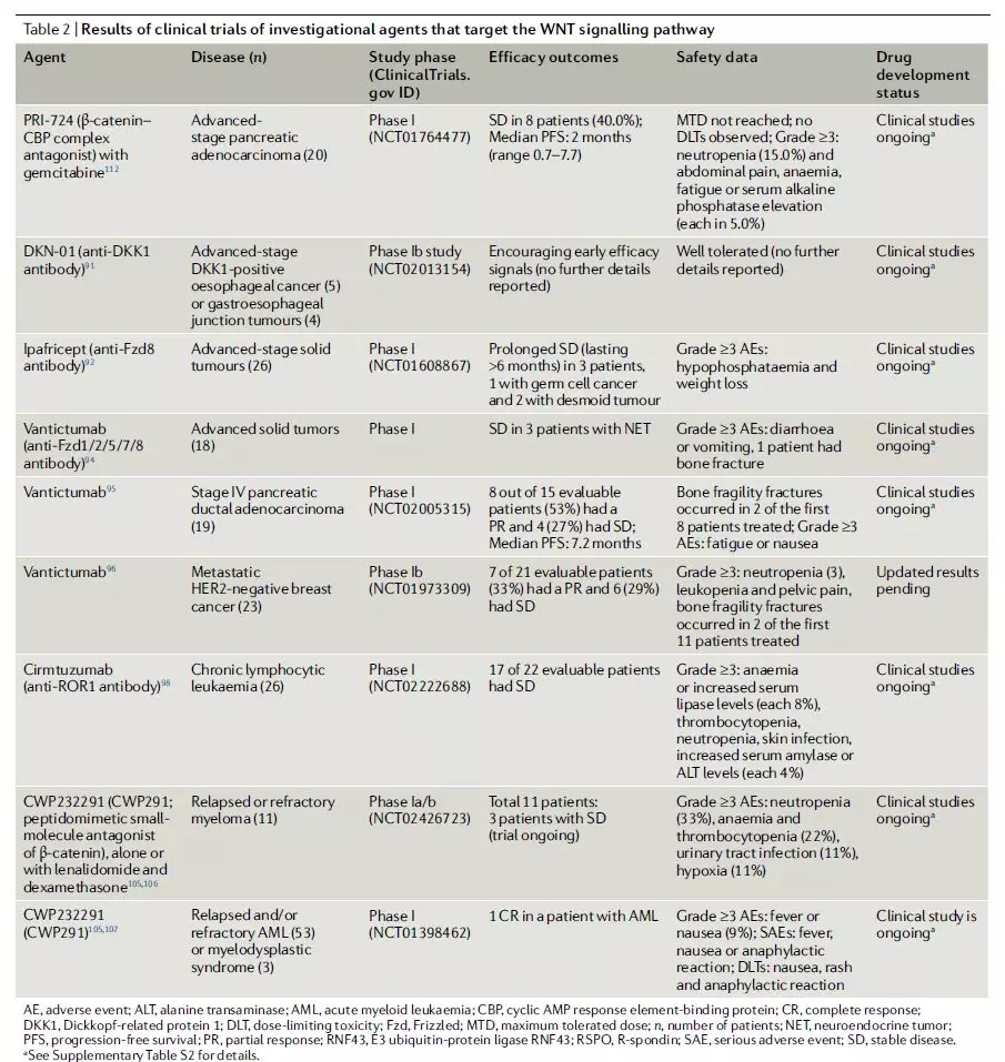 表2 靶向WNT信号通路的在研药物的临床试验结果