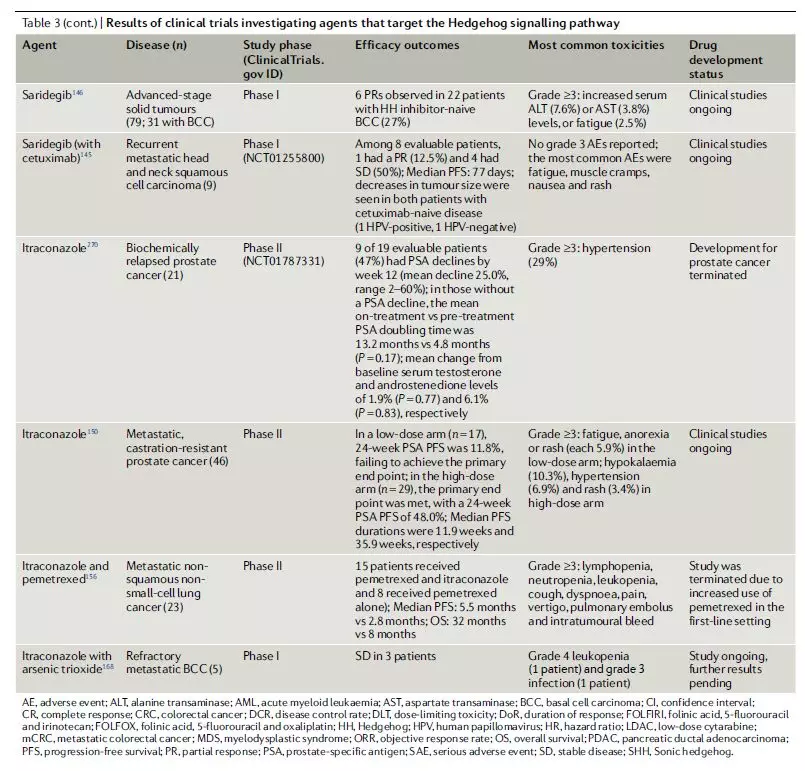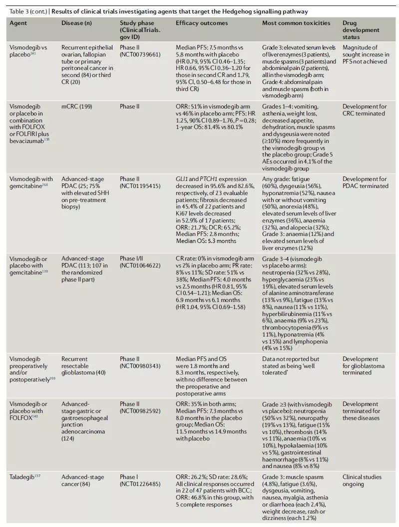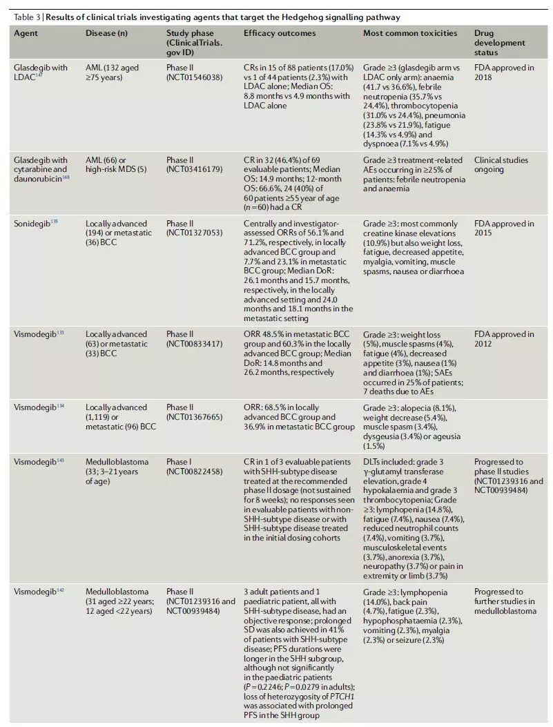 表3 调查靶向Hedgehog信号通路的药物的临床试验结果