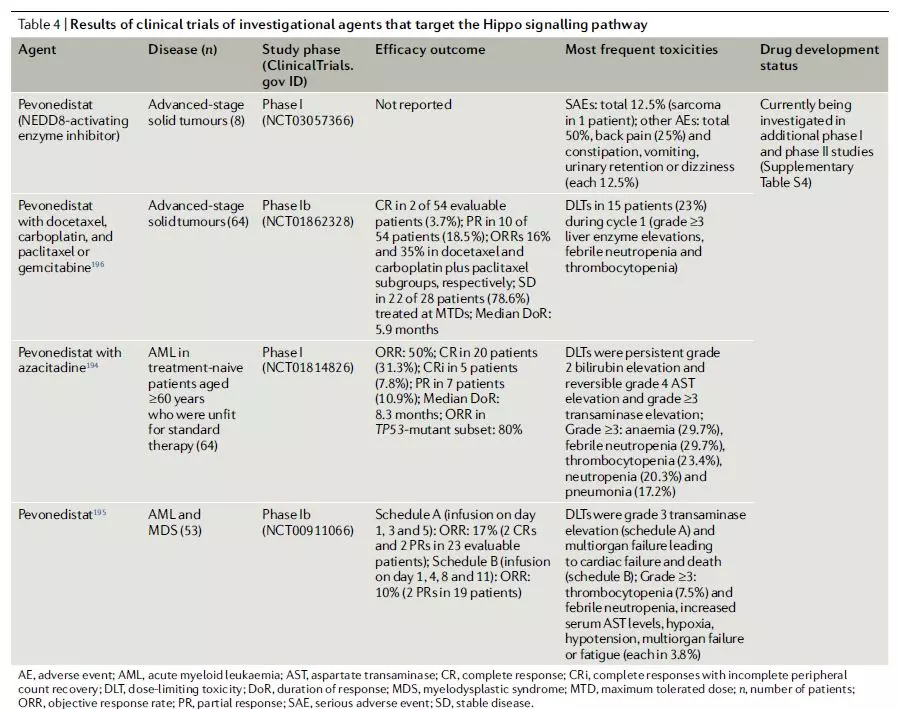 此外,first-in-class NEDD8激活酶抑制剂pevonedistat已被证实可阻止CRL4DCAF1介导的LATS1/2降解,从而减弱YAP1活性(图4)。在一项涉及急性髓系白血病(AML)和骨髓增生异常综合征(MDS)患者的I期试验中,pevonedistat联合azacitidine导致了50%的ORR,患者接受6个周期以上治疗后,ORR上升到了83%。在涉及髓系恶性肿瘤或晚期实体瘤患者的其它早期试验中,Pevonedistat作为单药以及联合其它药物也显示出了活性(表4)。