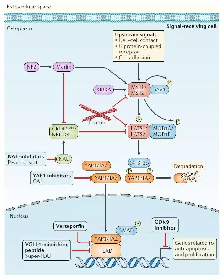 图4 Hippo信号通路和相关治疗靶点(图片来源:Nature Reviews Clinical Oncology)